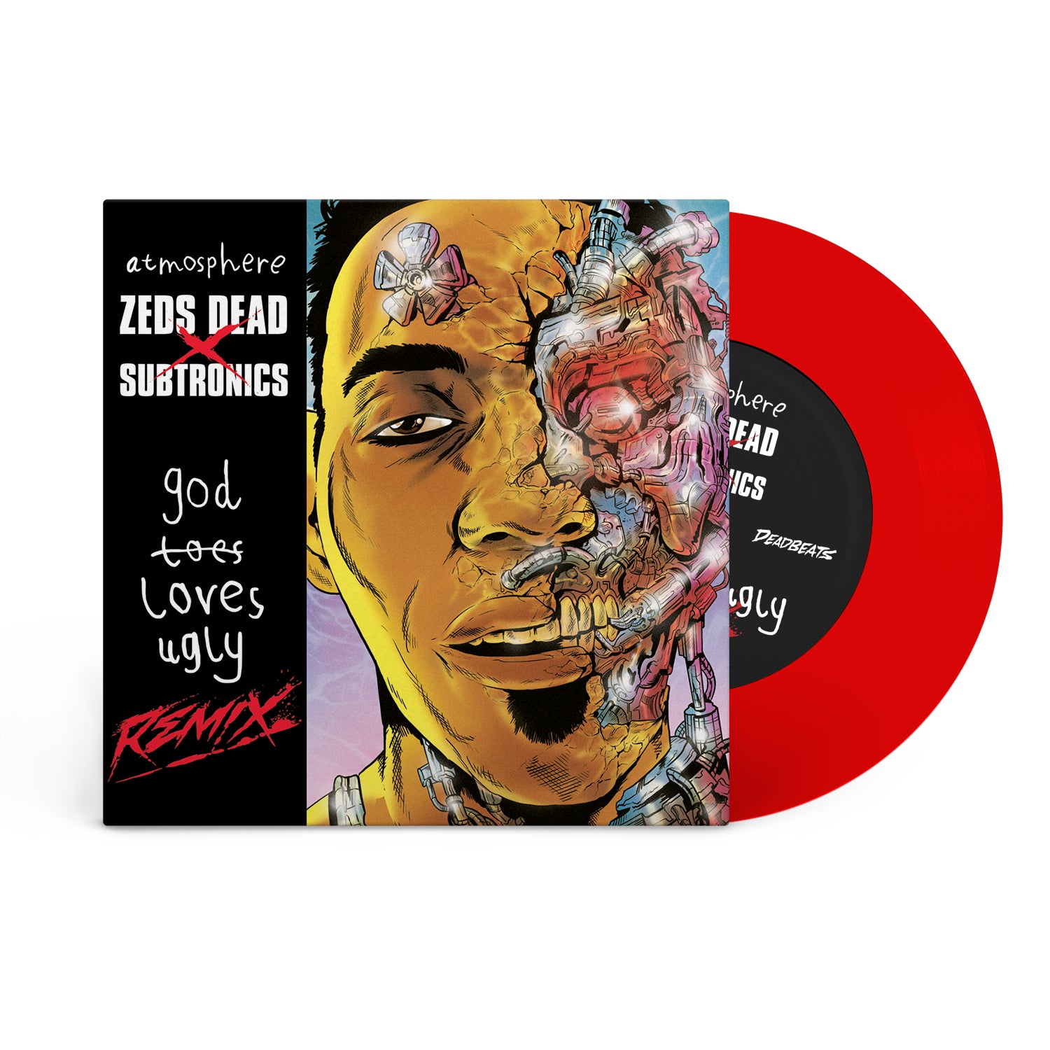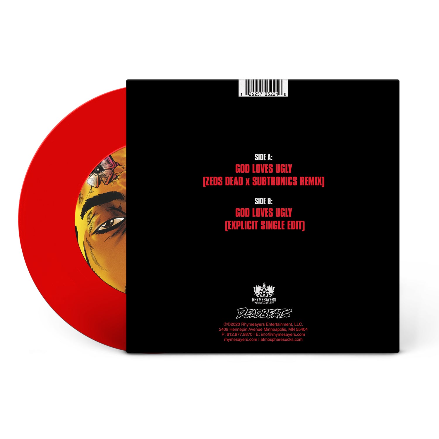The GodLovesUgly Remix has been paired with the original on this limited-edition 7" pressed on red vinyl, with the original God Loves Ugly album cover art re-envisioned and illustrated by Chris Yee.